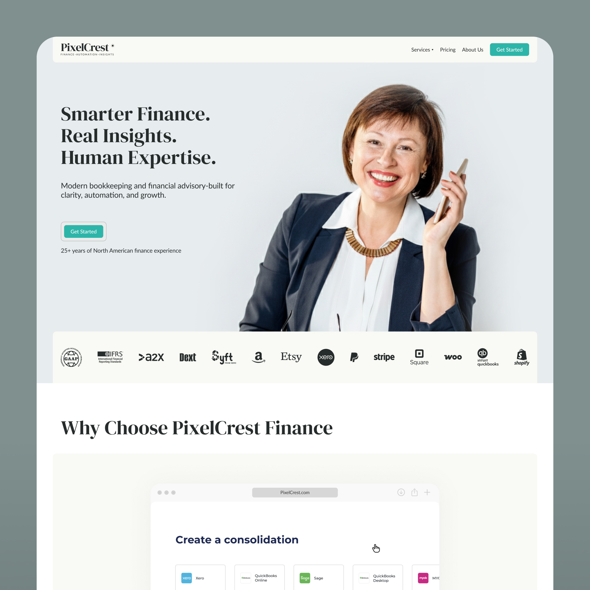 PixelCrest Finance is a bookkeeping and financial advisory firm built for North American businesses that expect more than basic accounting. Their team brings over 25 years of finance leadership experience — from Fortune 500 corporations to growing startups — and delivers automated, insight-driven financial operations through a combination of intelligent tooling and human expertise. Their service stack spans automated bookkeeping, CFO-level advisory, accounting and financial insights, and integrations with platforms like QuickBooks, Xero, Dext, and A2X.