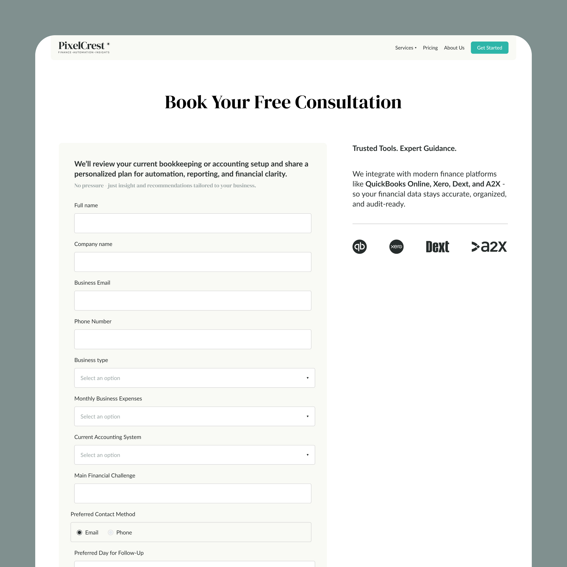 The consultation form was built as a structured qualification step rather than a generic contact form. It collects business type, monthly expenses, current accounting system, and main financial challenge — so the first conversation PixelCrest has with a lead is already informed by context, not starting from zero.