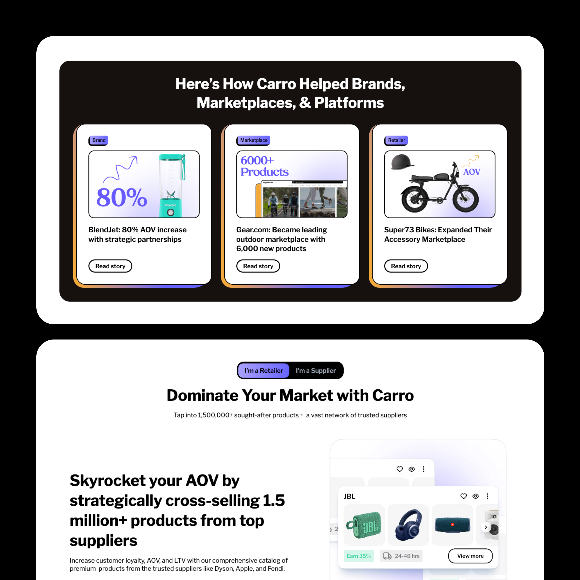 GetCarro needed to build a marketing foundation for promoting a robust and scalable platform from the ground up that could seamlessly connect thousands of brands and retailers. The core challenge was to create an intuitive user experience for both suppliers and retailers into the industry of real-time inventory syncing, dynamic revenue splitting, and secure payment processing. The platform had reflect reliability, safety, high-. volume capacity and partnership.